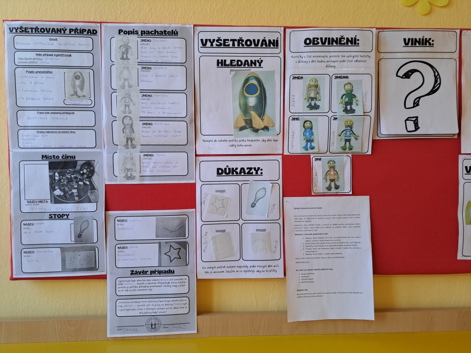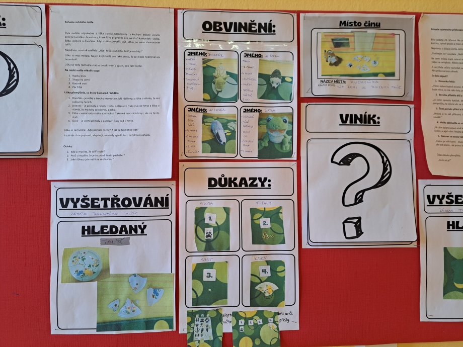 Společně jsme řešili například Záhadu ztracené vesmírné rakety, Záhada rozbitého talíře, Záhada tajemného překvapení a také Záhada otrávené laguny. Děti pracovaly se stopami, popisovaly podezřelé a vysvětlovaly, proč si myslí, že právě oni jsou viníci. Vyzkoušely si také jednoduché pokusy, detektivní pomůcky a prvky digitalizace.