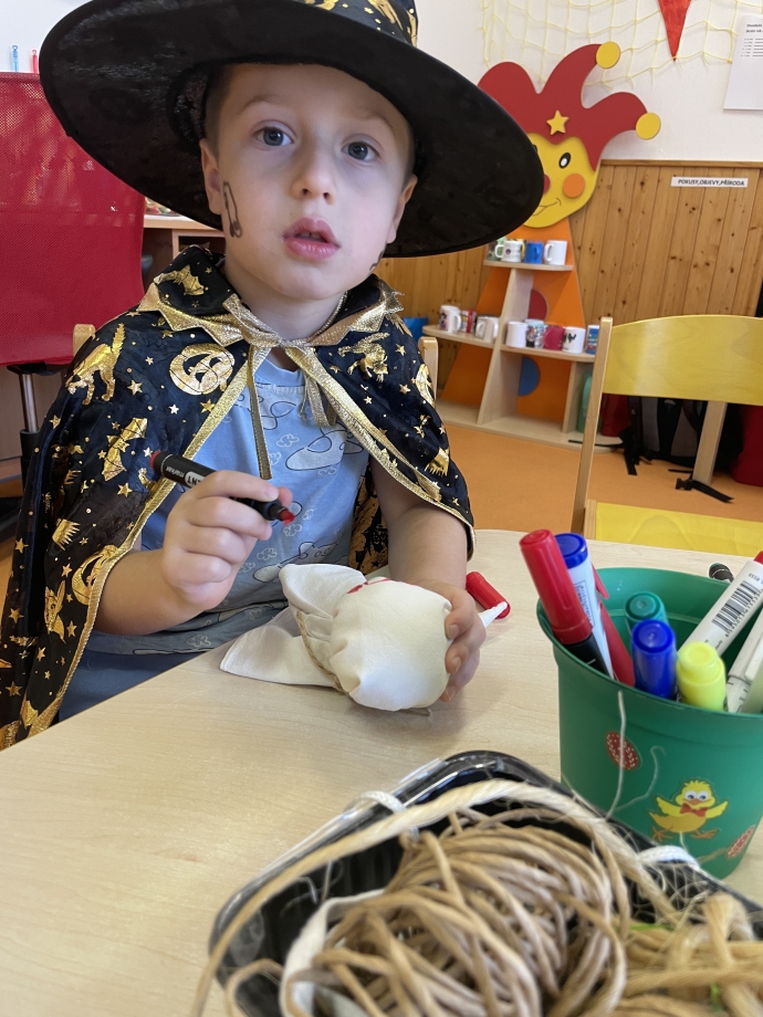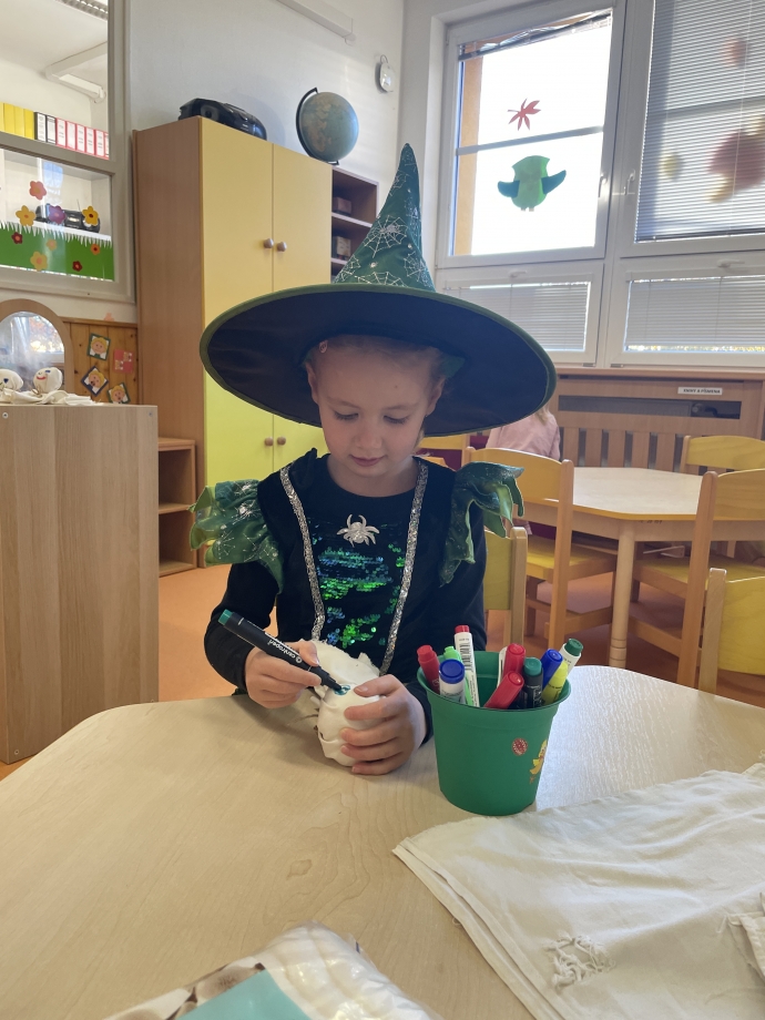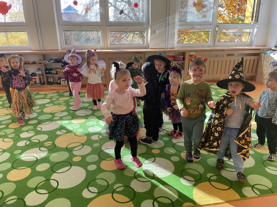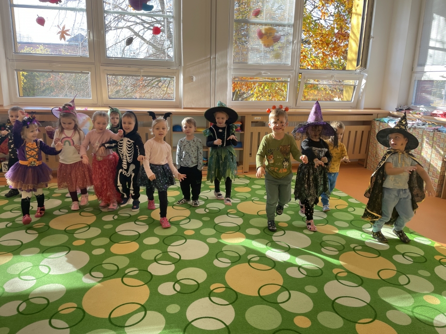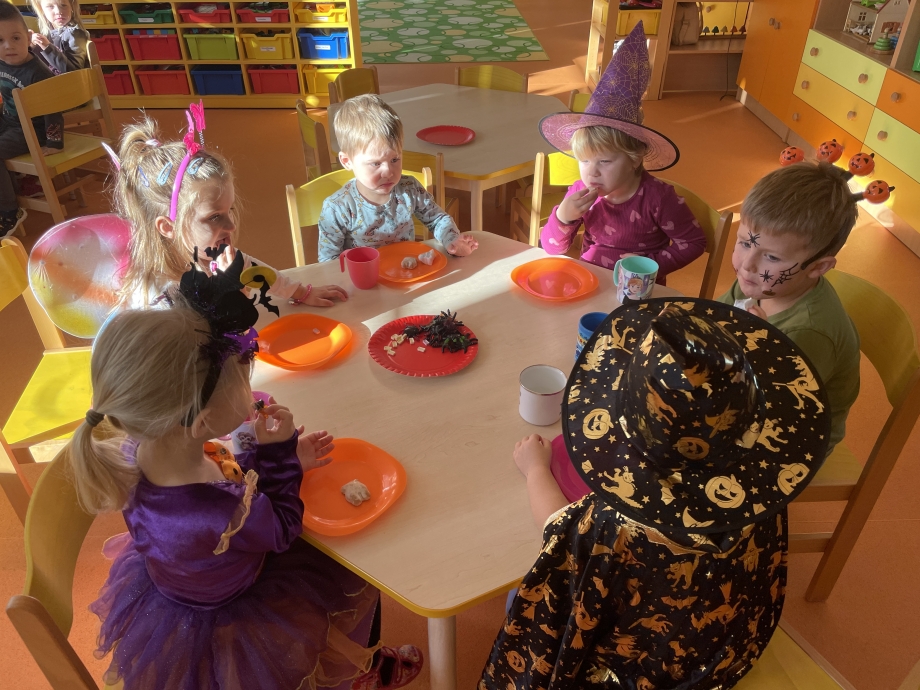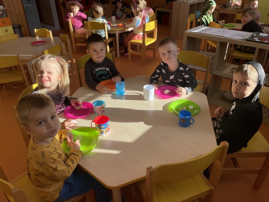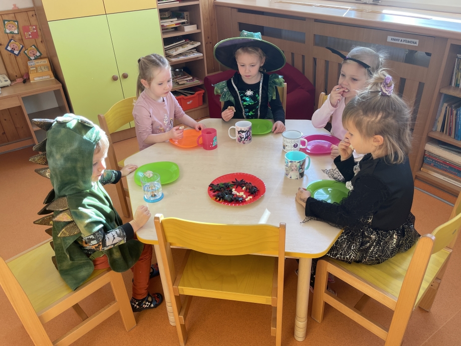 V pátek 31. 10. jsme si ve školce užili halloweenského skotačení. Namaškařili jsme se za různé strašidelné bytosti, zpívali písničky o strašidlech, strašidelně jsme cvičili a tančili a dokonce jsme strašidelně mlsali. Zajímá vás, co bylo na menu? Inu pavouci, brouci a jiné hmyzí pochutiny.