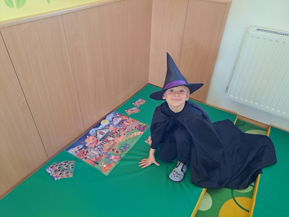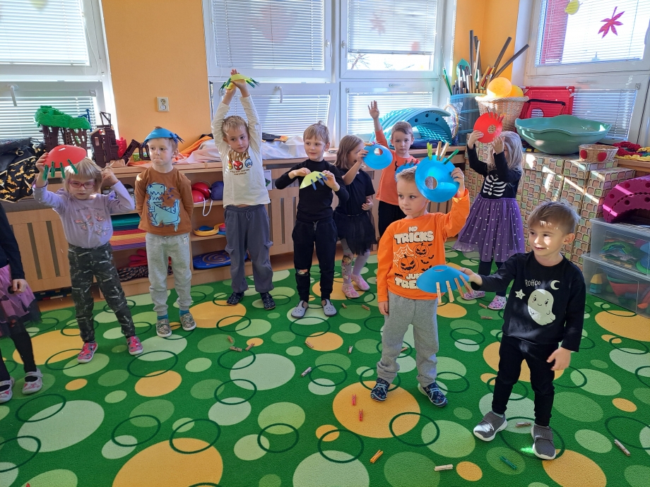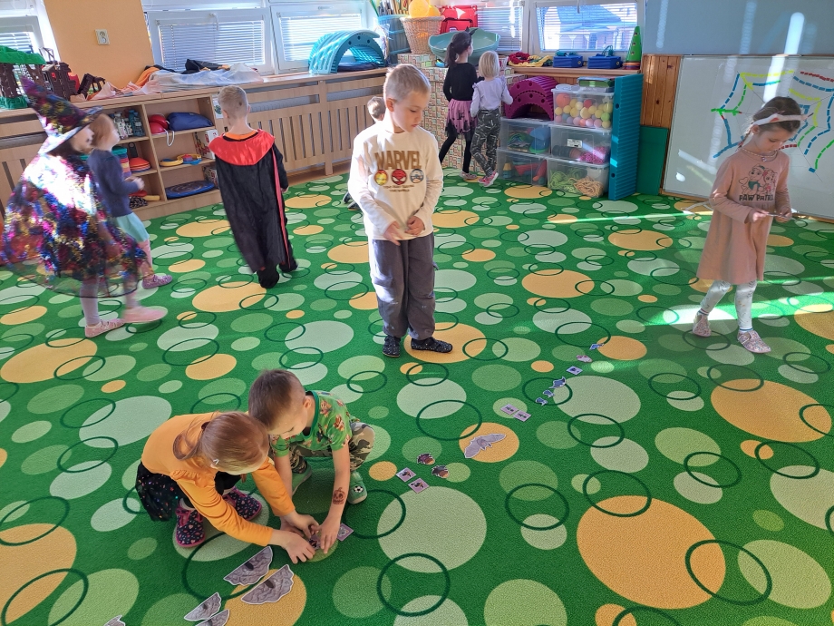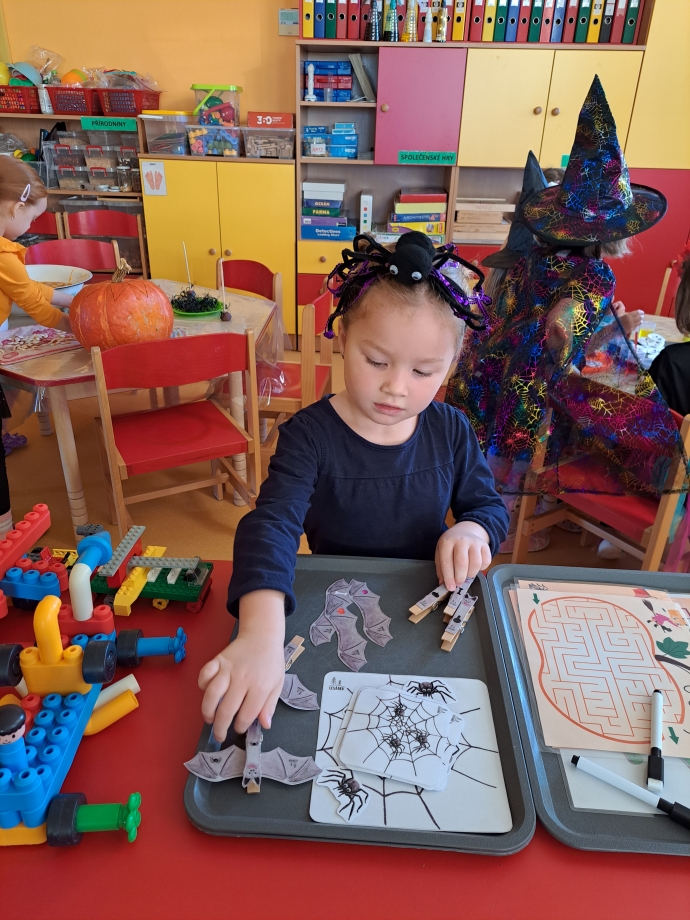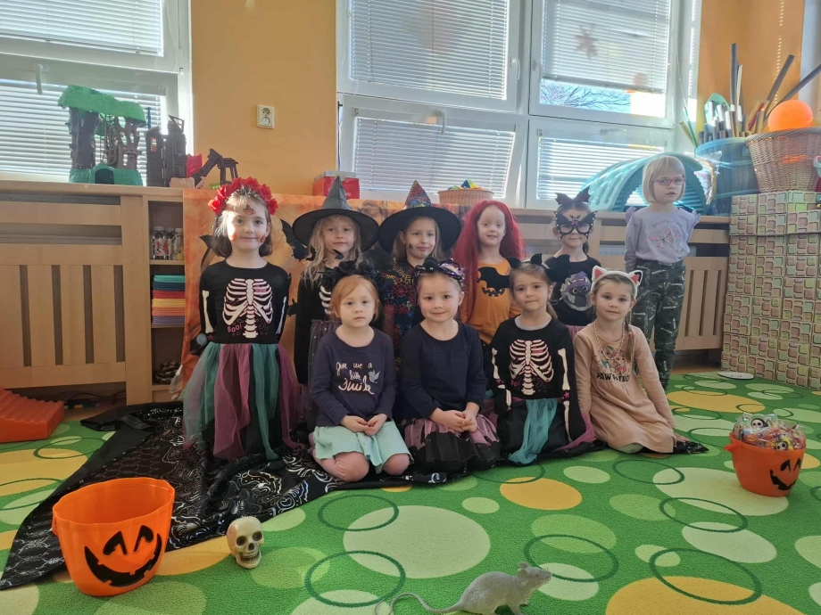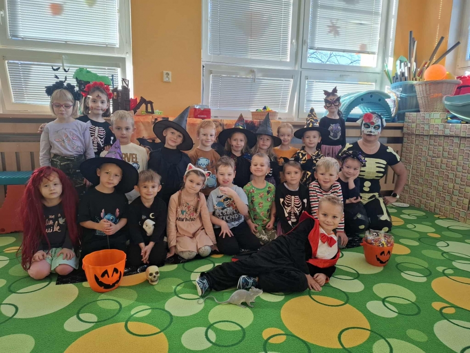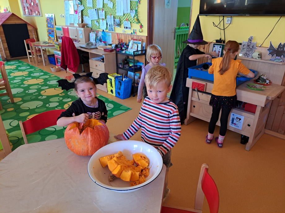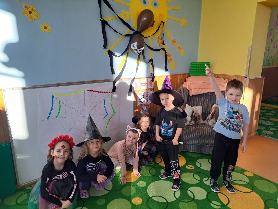 V naší mateřské škole jsme si užili pořádně strašidelný Halloween! Paní učitelka Jana – tentokrát v podobě kostlivce – proměnila naši třídu ve strašidelnou laboratoř plnou hrůzostrašně zábavných aktivit. Dlabali jsme strašidelnou dýni, obvazovali mumie, zkoušeli barevné dýňové pokusy a počítali pavouky. Tvořili jsme netopýří obrázky, lepili obrovskou pavučinu s mega pavoukem, zkoušeli vyléčit upíří zuby, stavěli hrad s duchy i strašidelný zámek z písku. Ve Frankensteinově kuchyňské laboratoři jsme objevovali tajemné ingredience a v kostlivcově koutku skládali kosti. Nechyběly ani pohybové hry – pingpong s duchem, házení dýní či střílení na pavoučí síť.