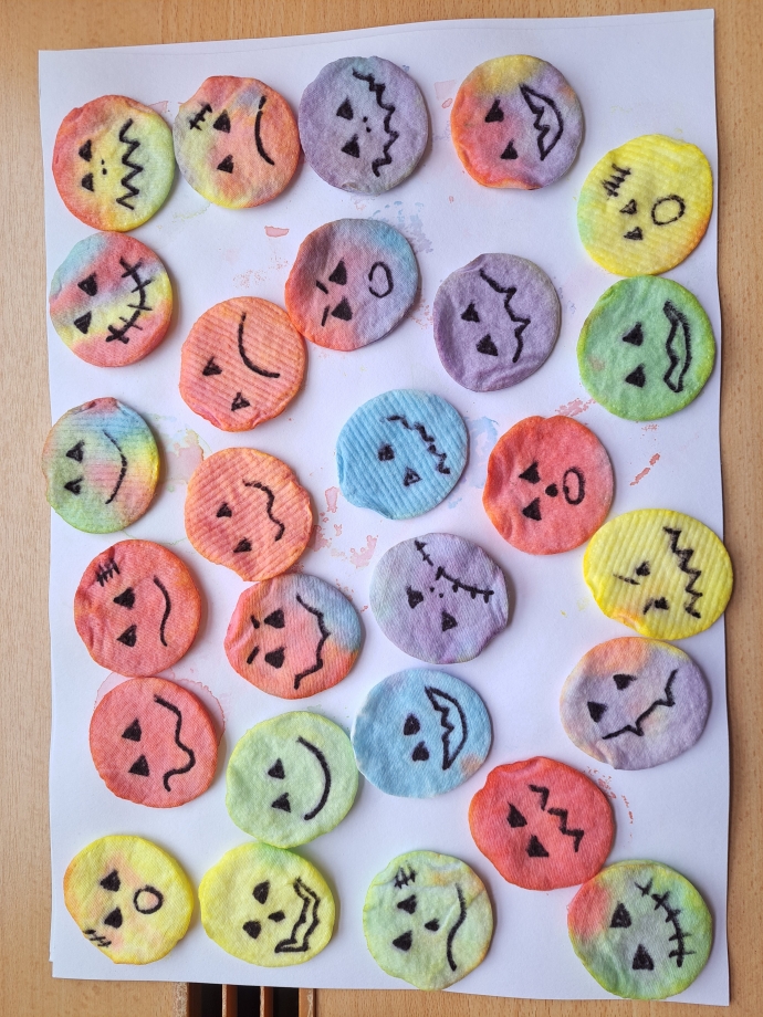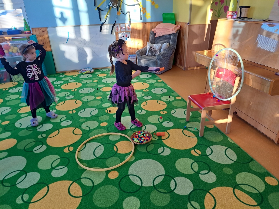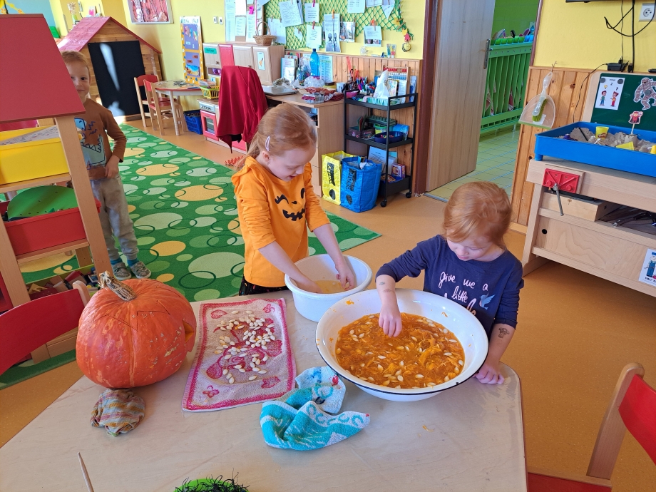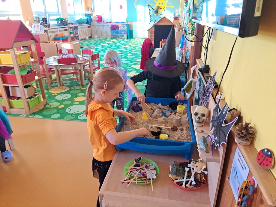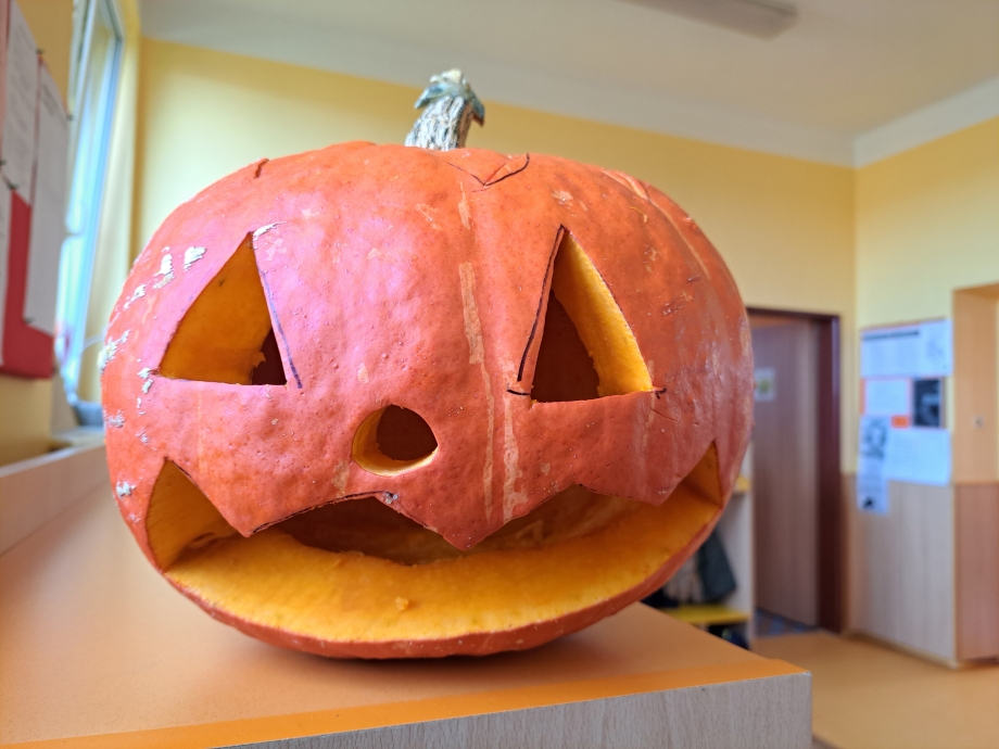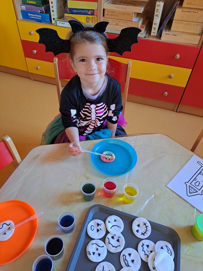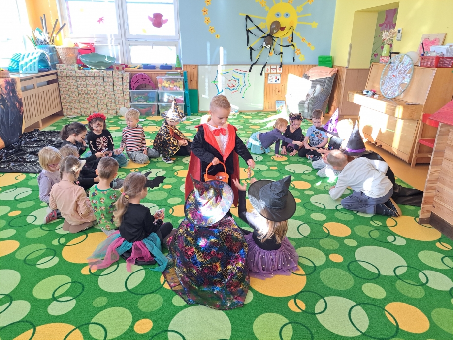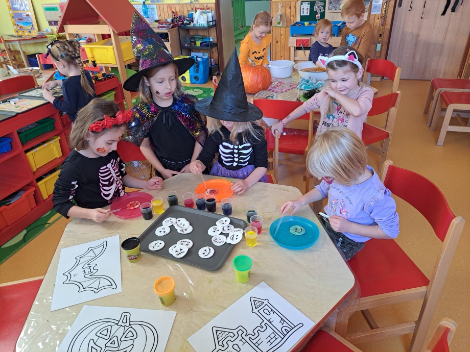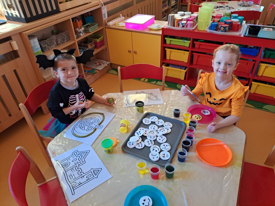 V naší mateřské škole jsme si užili pořádně strašidelný Halloween! Paní učitelka Jana – tentokrát v podobě kostlivce – proměnila naši třídu ve strašidelnou laboratoř plnou hrůzostrašně zábavných aktivit. Dlabali jsme strašidelnou dýni, obvazovali mumie, zkoušeli barevné dýňové pokusy a počítali pavouky. Tvořili jsme netopýří obrázky, lepili obrovskou pavučinu s mega pavoukem, zkoušeli vyléčit upíří zuby, stavěli hrad s duchy i strašidelný zámek z písku. Ve Frankensteinově kuchyňské laboratoři jsme objevovali tajemné ingredience a v kostlivcově koutku skládali kosti. Nechyběly ani pohybové hry – pingpong s duchem, házení dýní či střílení na pavoučí síť.