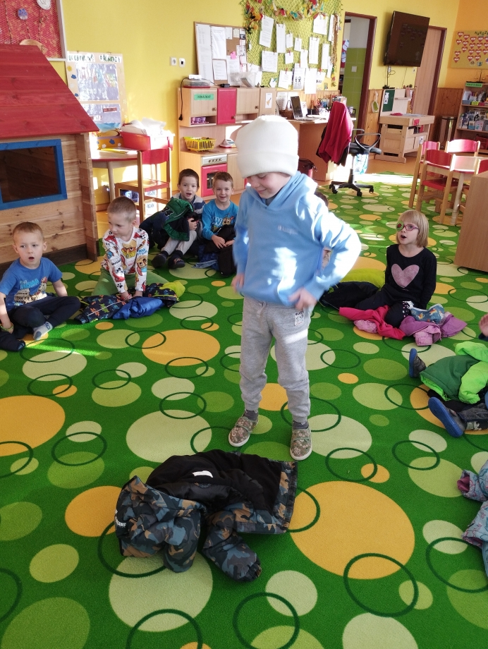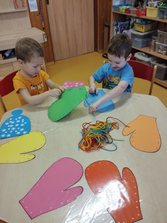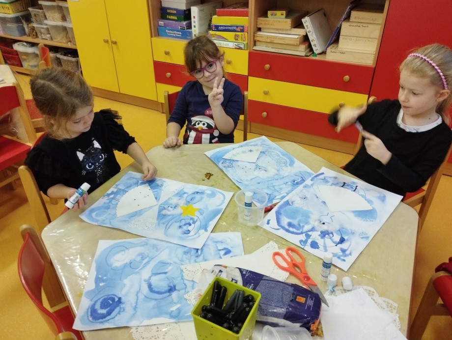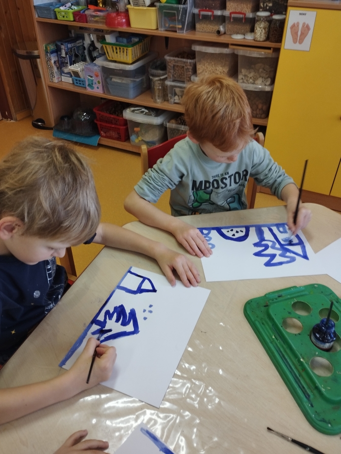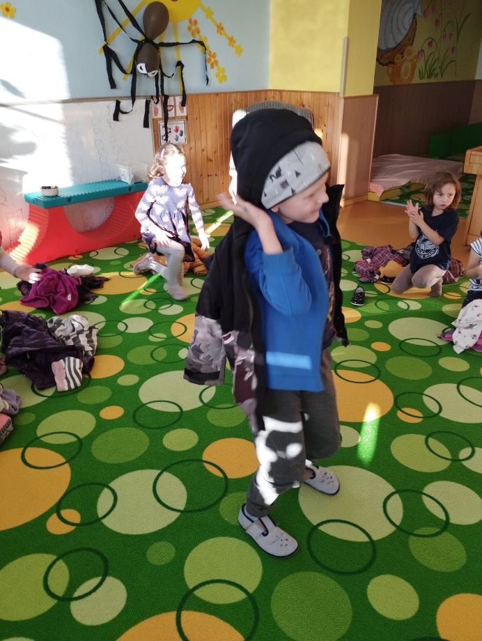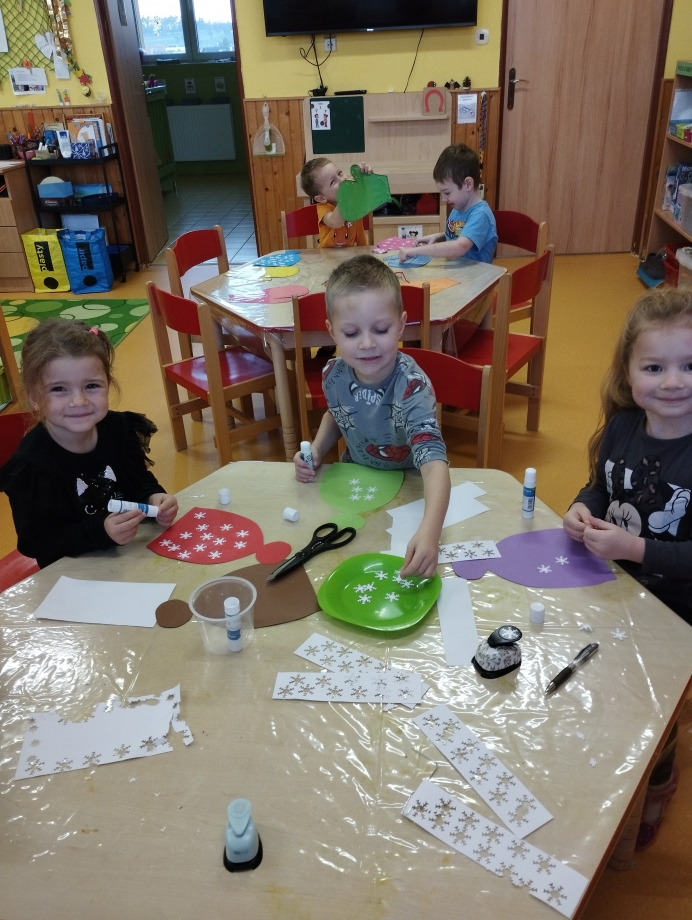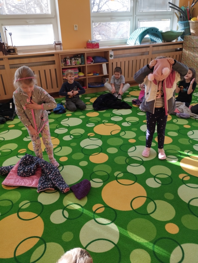Dětem jsme poskytovali prostor pro vlastní prožitek, fantazii a tvořivost. Zajímavé byly pokusy s vodou a ledem, nebo zapouštění barvy do mokrého podkladu. Veselá byla také soutěž v oblékání do zimního oblečení.