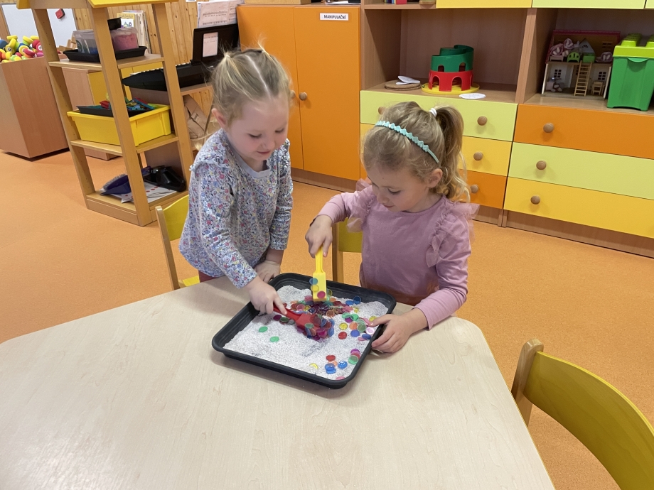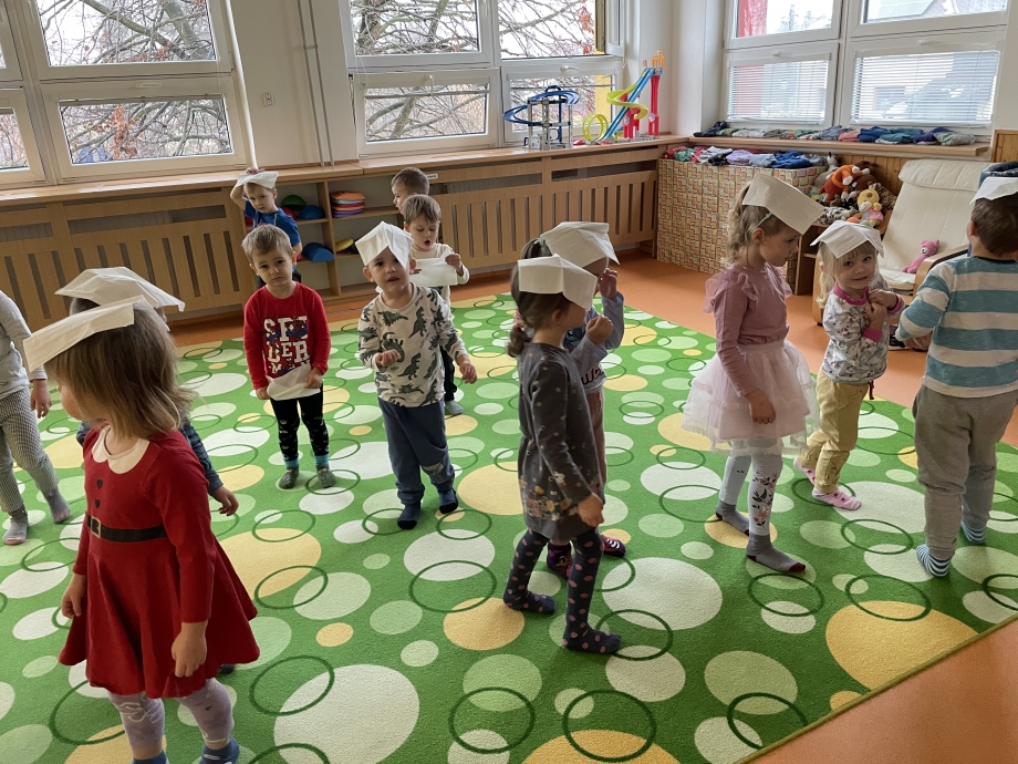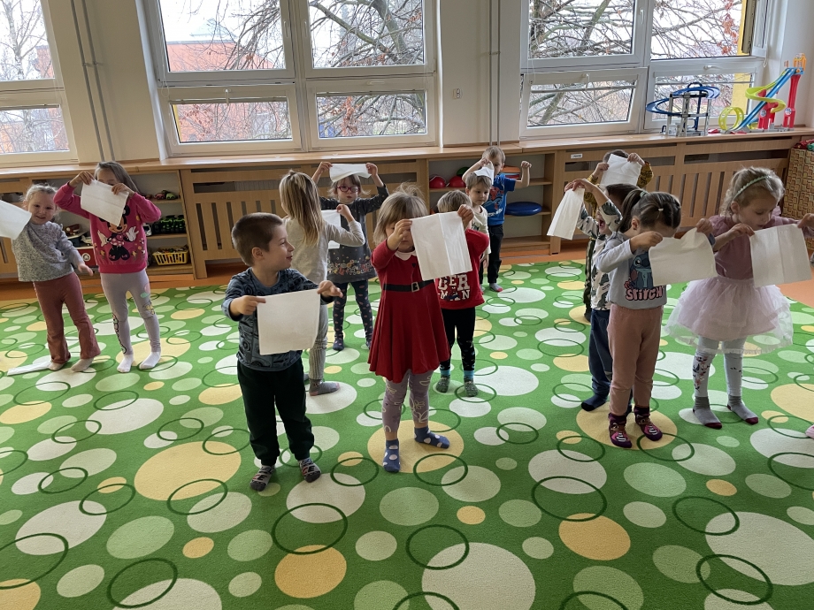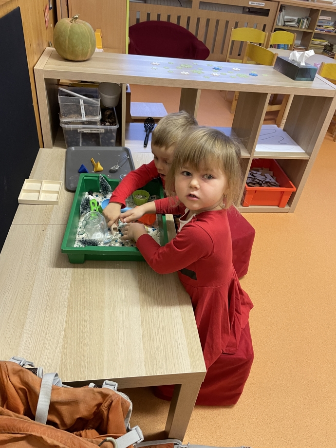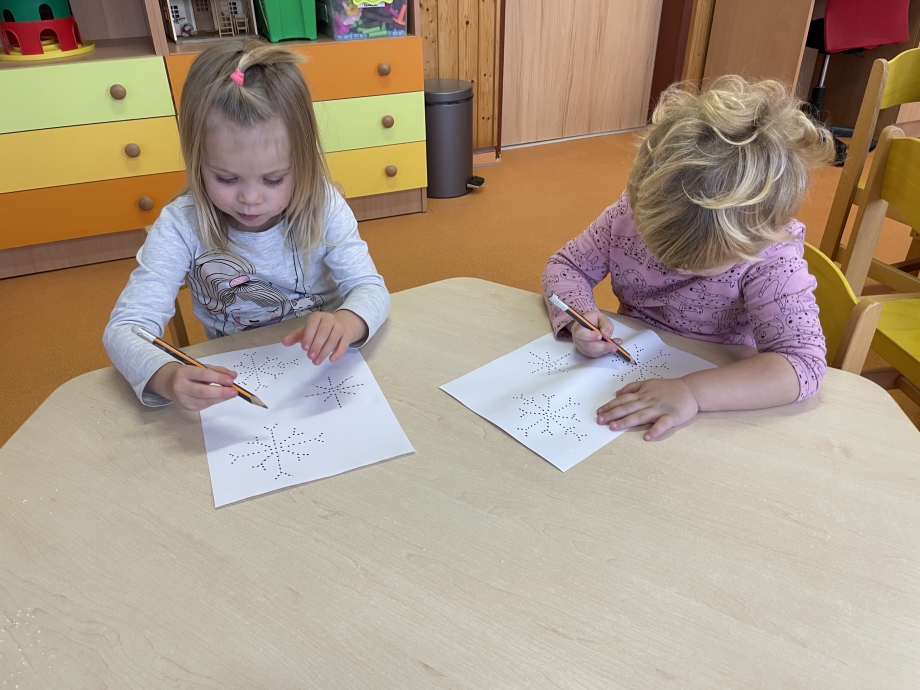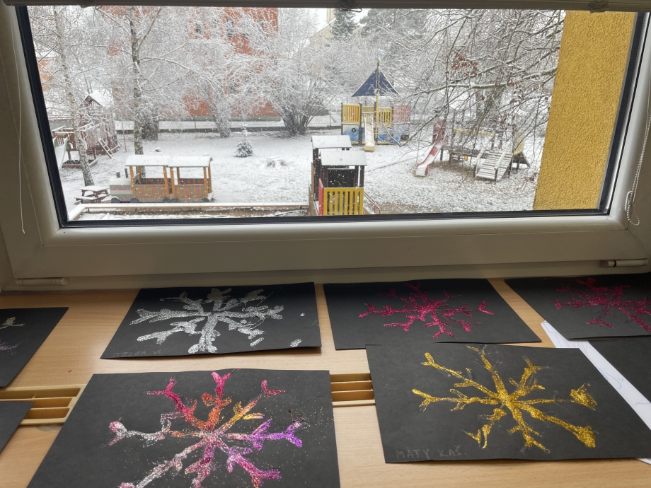 Ó, ta krása! První sněhové vločky se snesly o víkendu a po úterní oblevě na svátek Kateřiny se opět rozsněžilo. A to tak, že jsme postavili prvního sněhuláka a párkrát si sjeli na bobech a lopatách kopeček na zahradě MŠ!