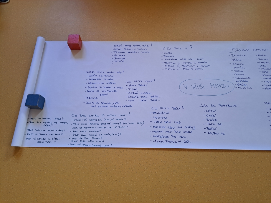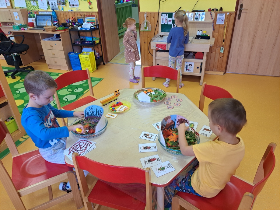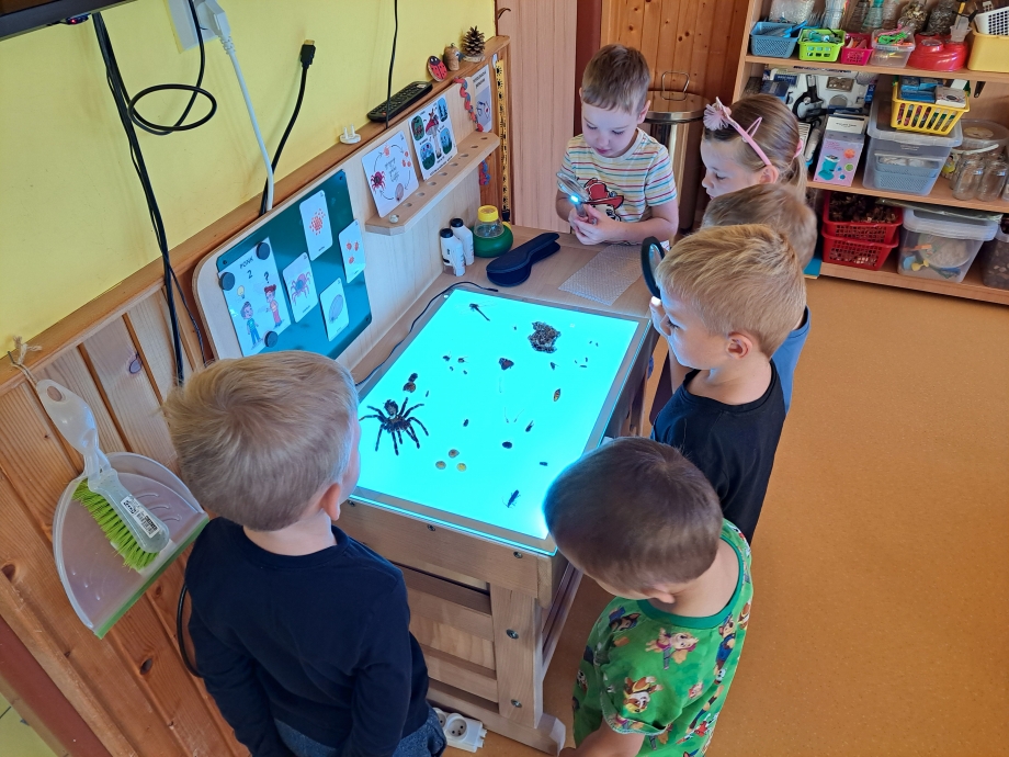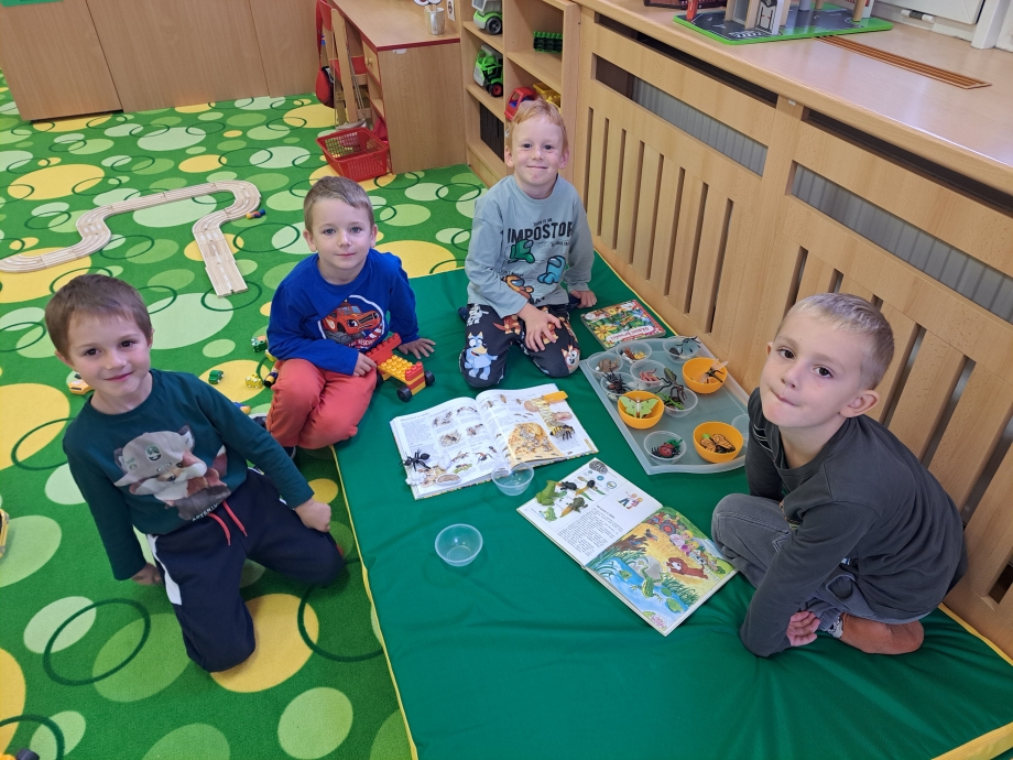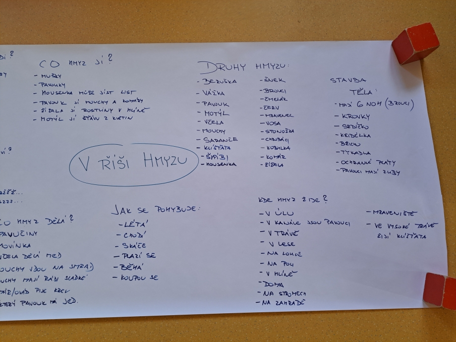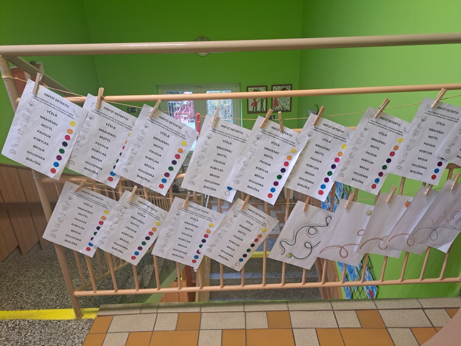 Naše třída se proměnila v opravdovou říši hmyzu! Děti mohly objevovat, zkoumat i prožívat svět malých tvorů, o kterých se celý týden učily. Společně jsme vytvořili myšlenkovou mapu, ke které jsme se během týdne vraceli a doplňovali ji o nové poznatky. Děti se prostřednictvím her a aktivit dozvěděly spoustu zajímavostí o hmyzu i jeho životě. Týden jsme zakončili krásnou odpolední akcí s rodiči – Uspávání broučků a zvířátek s lampionovým průvodem, který dodal celé atmosféře kouzelný podzimní nádech.