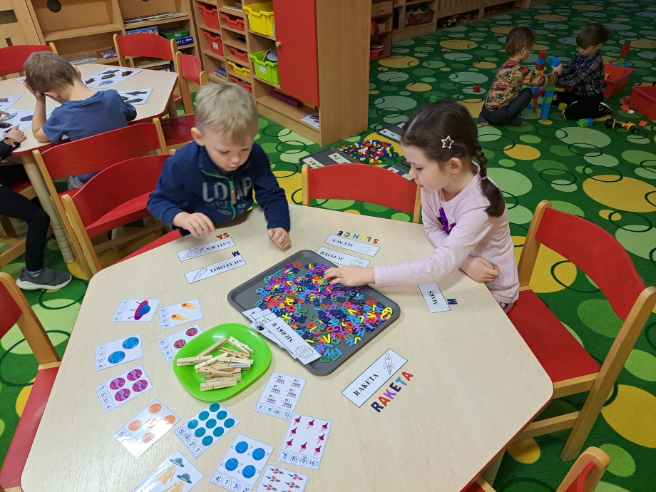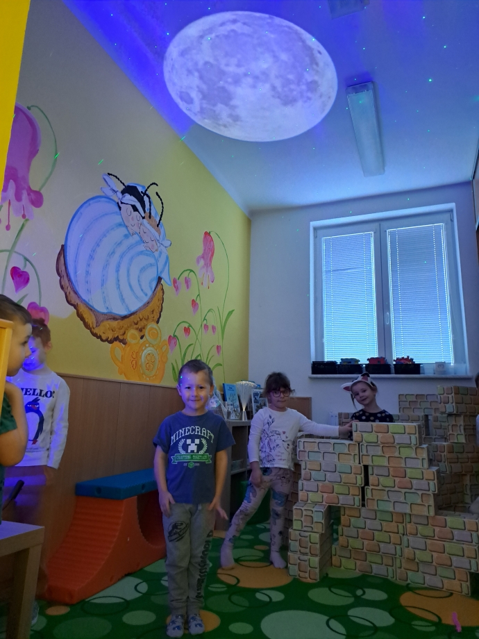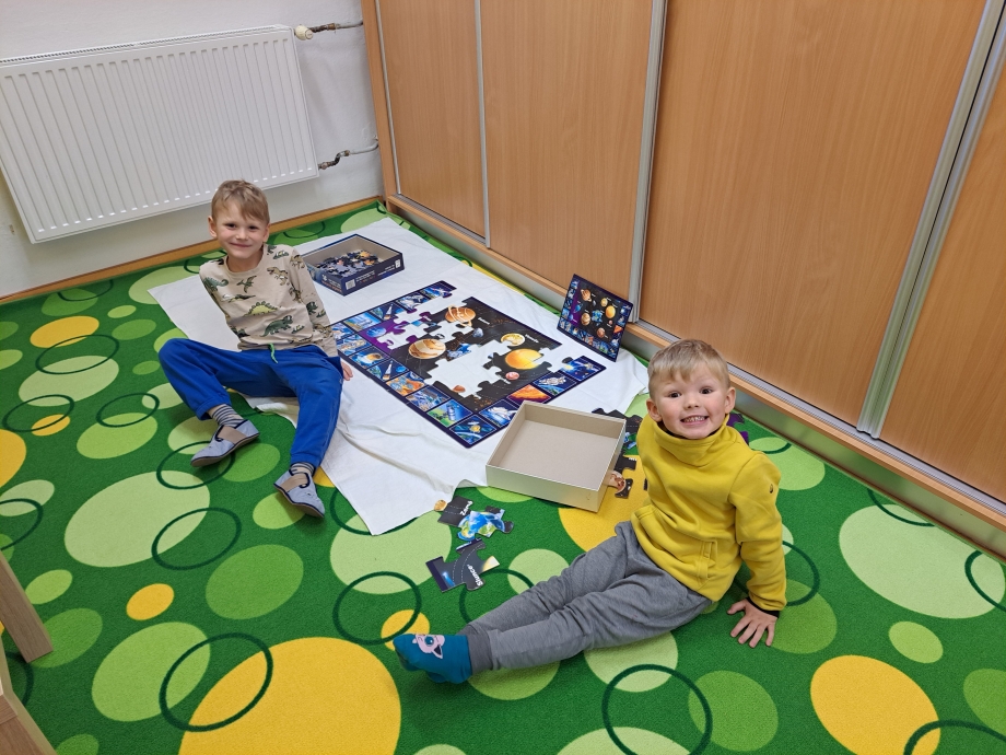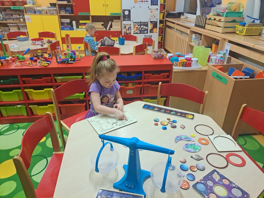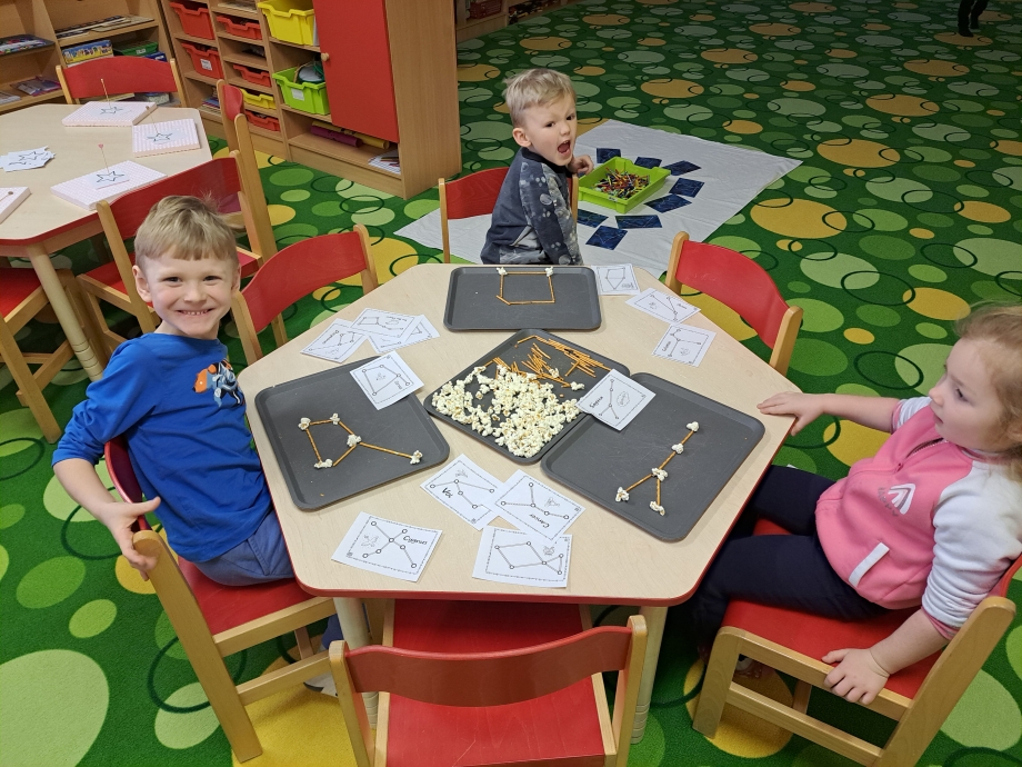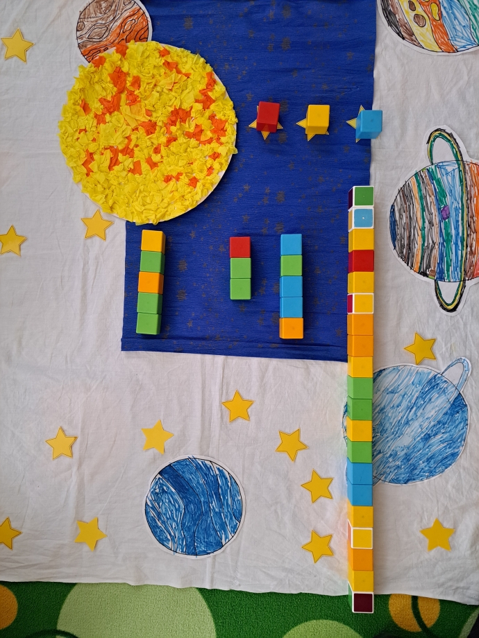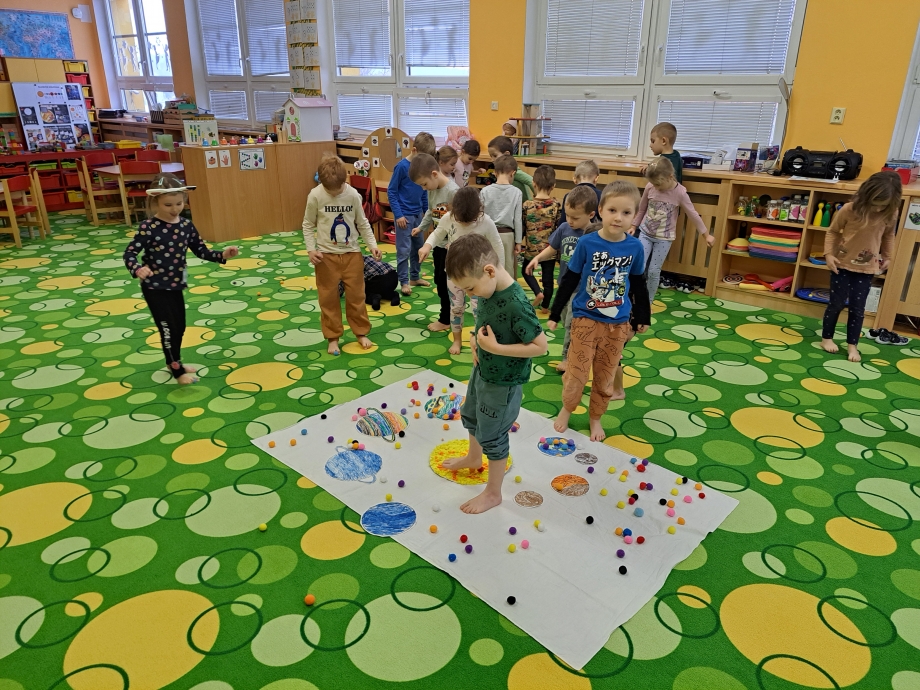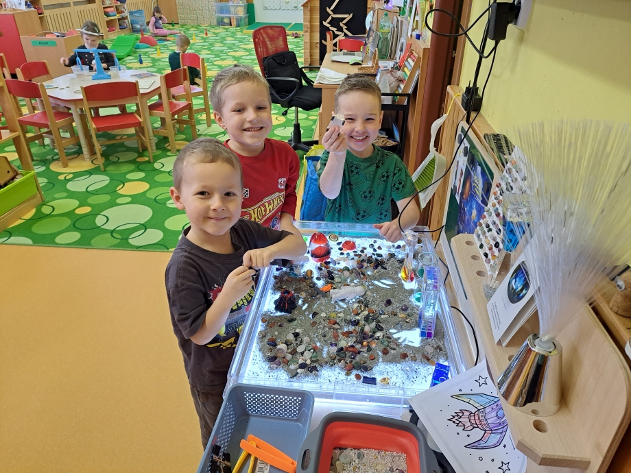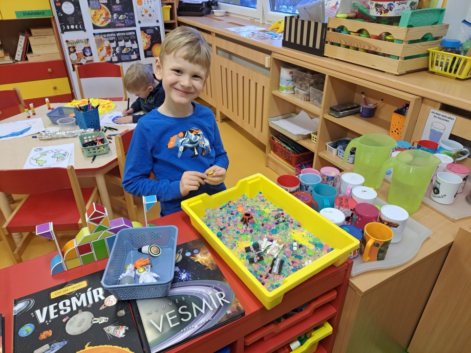Naši vesmírnou výpravu doplňovaly krátké vzdělávací pohádky a projekce, díky nimž jsme mohli sledovat, jak vypadají planety sluneční soustavy, galaxie Mléčná dráha, Měsíc i tajemná černá díra. V encyklopediích jsme objevovali další zajímavosti a odpovědi na zvídavé otázky malých badatelů. Nechyběla ani vlastní raketa, kterou jsme si společně postavili a symbolicky s ní odstartovali na vesmírnou misi.