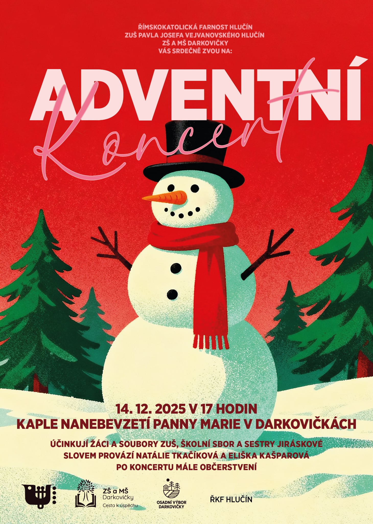 Dovolujeme si vás pozvat na "Adventní koncert", který se uskuteční v neděli 14.12.2025 od 17,00 h v kapli Nanebevzetí Panny Marie v Darkovičkách.