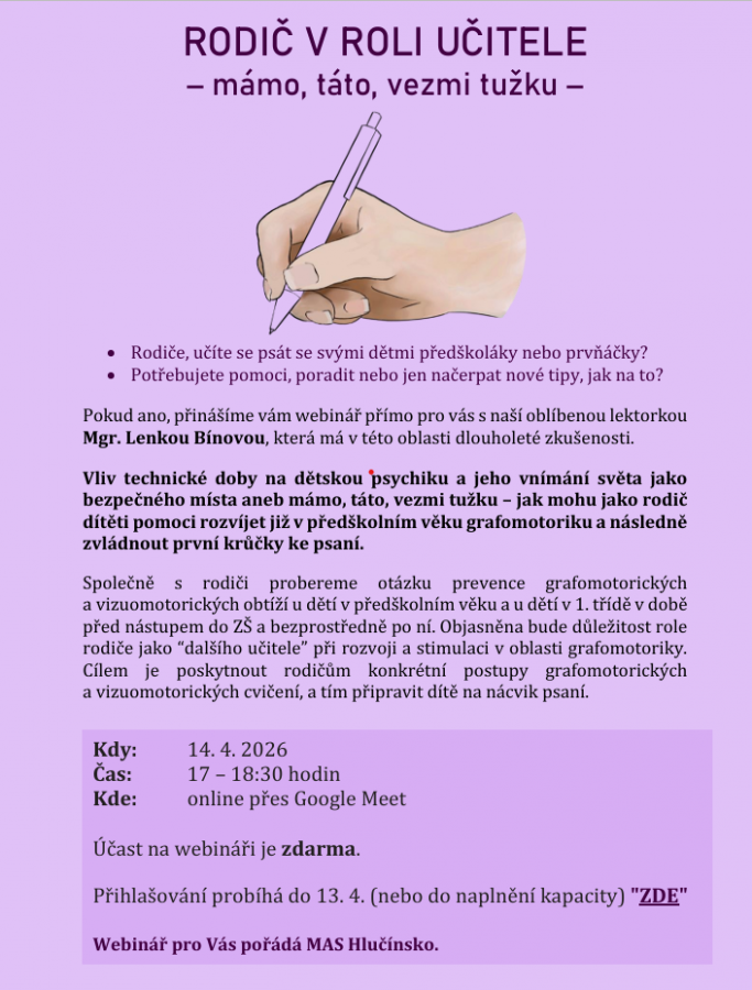 Online webinář „Mámo, táto, vezmi tužku“ se koná 14. 4. 2026 od 17:00 do 18:30 a je zdarma. Je určen rodičům předškoláků a dětí v 1. třídě, kteří chtějí děti správně podpořit v psaní. Lektorka Mgr. Lenka Bínová poradí, jak rozvíjet grafomotoriku a vizuomotoriku v dnešní technické době. Součástí budou praktické tipy a konkrétní cvičení pro domácí nácvik. Přihlášení je možné do 13. 4. 2026 online.